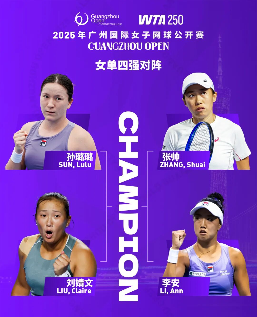 10月24日,2025年广州国际女子网球公开赛结束了女单四分之一决赛的争夺,张帅和三位华裔球员孙璐璐、李安、刘婧文包揽四强!10月25日,本届广网将展开单双打半决赛的争夺,欢迎来到南沙国际网球中心,见证单双打决赛阵容的产生! 两届赛会冠军张帅继续坐镇夜场,迎战美国名将沃利内茨,虽然在第二盘浪费了发球胜赛局被对手拖入决胜盘,决胜盘又浪费了一个发球胜赛局和连续两个赛点,但最终她还是以7-6(5)