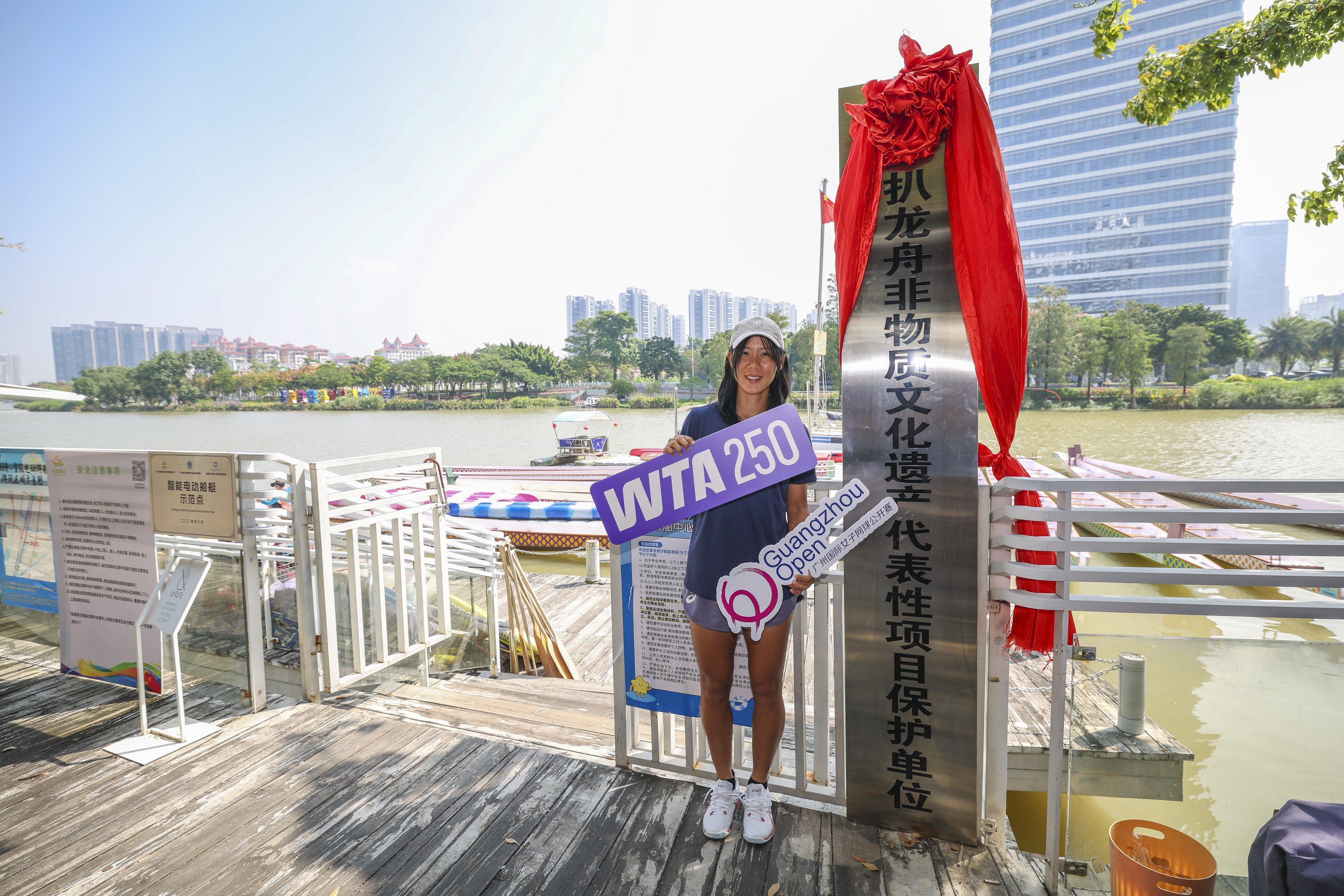 10月18日,参加2025年广州国际女子网球公开赛的两位球员艾米莉·阿普雷顿、杨一迪一行就来到蕉门河体验非遗项目“扒龙舟” 作为扒龙舟非物质文化遗产代表项目保护单位,蕉门河是南沙区境内众多河涌之一,它北接小虎沥,通至狮子洋,南连蕉门水道,直达珠江口,同时这里也是广州南沙重要的龙舟训练基地。今年举办的南沙龙舟大赛更是吸引了大湾区50余支参赛队伍,参赛选手超1500人,线上+线下观赛人数超200